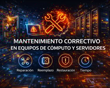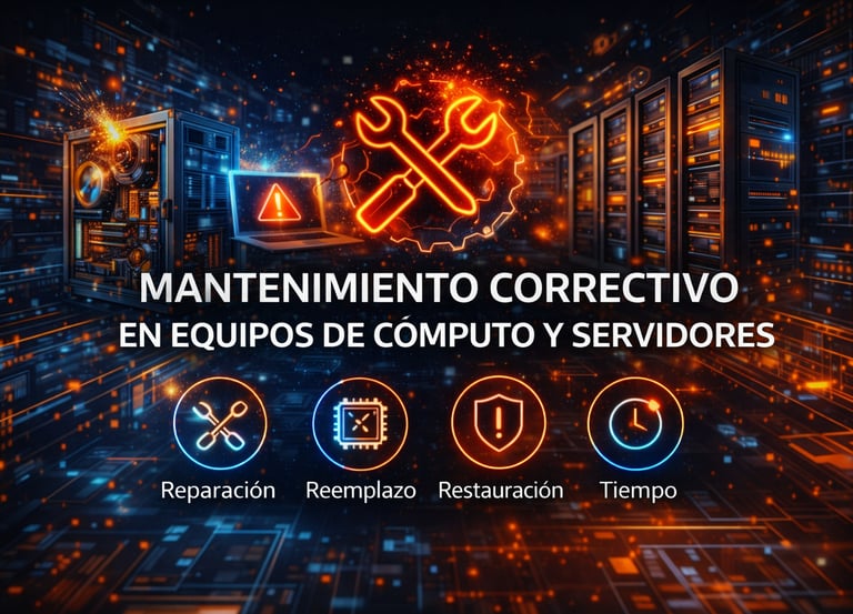 El mantenimiento correctivo se realiza cuando un equipo de cómputo o servidor presenta fallas o daños. Su objetivo es reparar o reemplazar componentes, restaurar el funcionamiento normal y minimizar el impacto en la operación, asegurando la continuidad del servicio lo antes posible.
